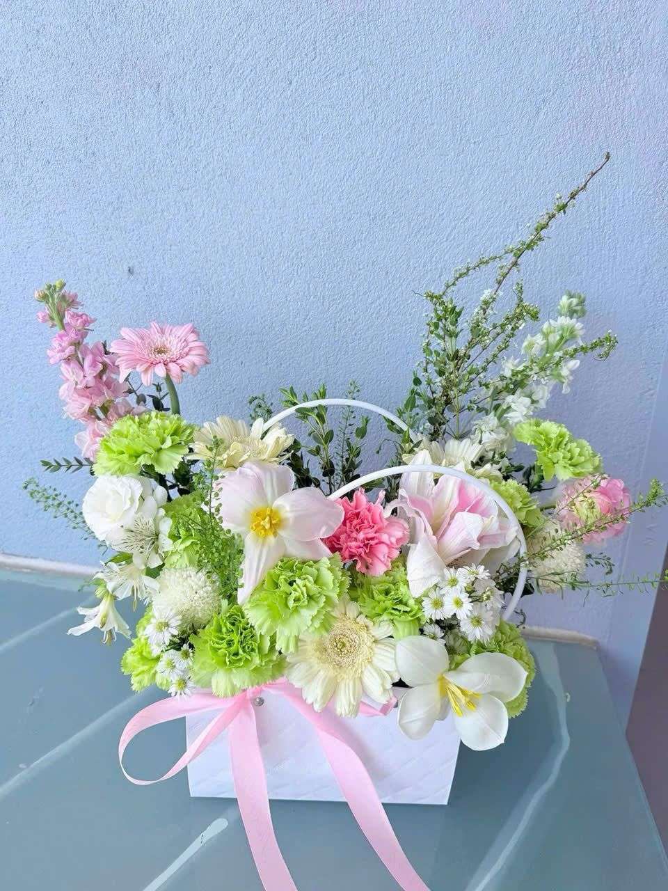 Sản phẩm mang vẻ đẹp thanh thoát và tinh tế, được tạo nên từ những chất liệu hoa tươi có tính thẩm mỹ cao như tulip sang trọng, phăng xanh dịu mắt, đồng tiền nhí trắng tươi sáng, ly kép nổi bật, tuyết mai mềm mại, phi yến thanh mảnh cùng cúc hoặc thạch thảo trắng nhẹ nhàng. Kết hợp với lá kiếm và cỏ đồng tiền, tổng thể thiết kế trở nên hài hòa, đầy đặn và có chiều sâu hơn, mang lại cảm giác vừa trang nhã vừa cuốn hút.