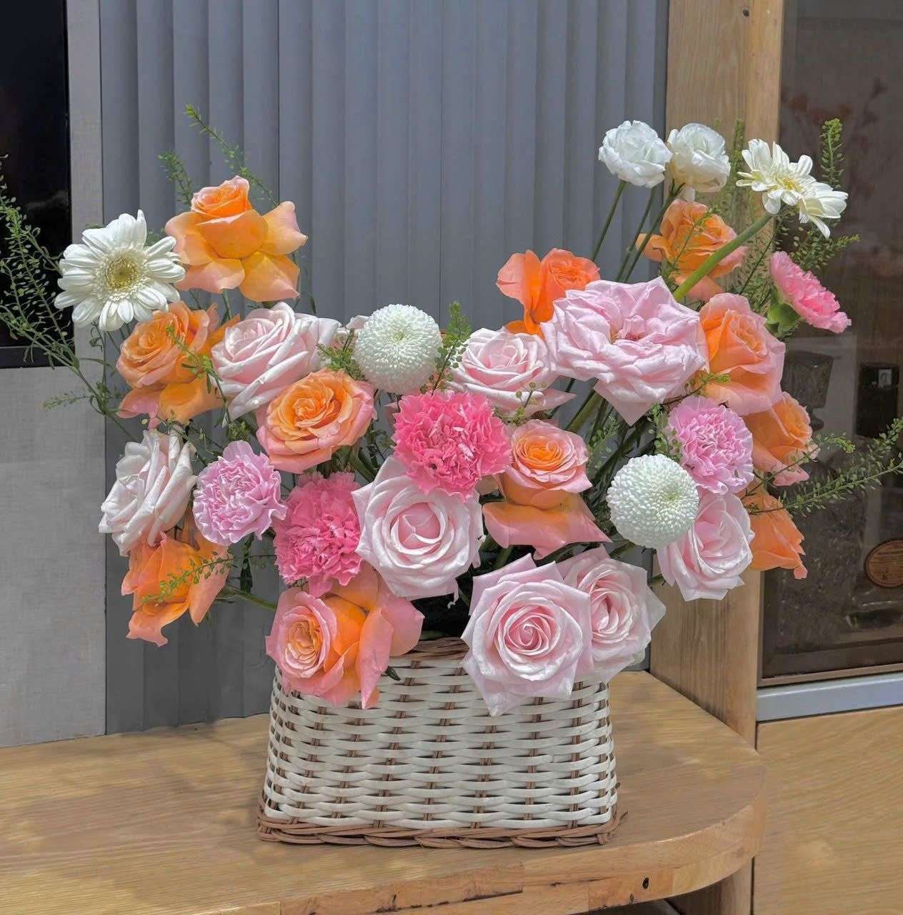 Sản phẩm mang vẻ đẹp dịu dàng, hài hòa và nổi bật, được tạo nên từ những chất liệu hoa tươi có màu sắc mềm mại nhưng vẫn cuốn hút. Hồng kem dâu đem đến cảm giác ngọt ngào và thanh lịch, hồng cam Spirit tạo điểm nhấn tươi sáng, ấm áp, phăng hồng góp phần tăng nét mềm mại, nữ tính, cúc pingpong tạo sự tròn đầy đáng yêu, trong khi đồng tiền nhí trắng giúp tổng thể thêm tươi mới và hài hòa hơn.