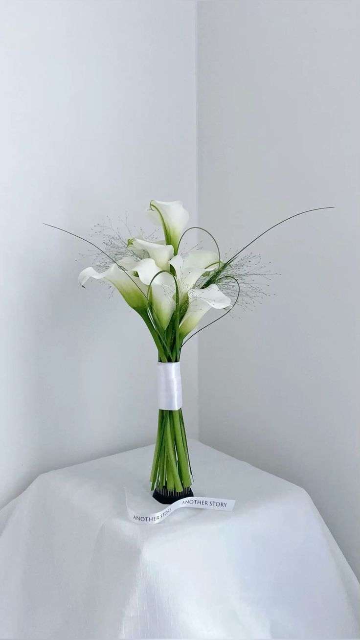 Hoa cưới cầm tay calla lily kết hợp cỏ suối là lựa chọn hoàn hảo cho những cô dâu yêu thích vẻ đẹp tối giản nhưng vẫn nổi bật và cuốn hút. Những bông calla lily trắng với dáng hoa mềm mại, thanh cao tạo nên tổng thể tinh khôi và sang trọng, trong khi cỏ suối được điểm xuyết khéo léo giúp bó hoa thêm phần bay nhẹ, mềm mại và có nét tự nhiên hơn.