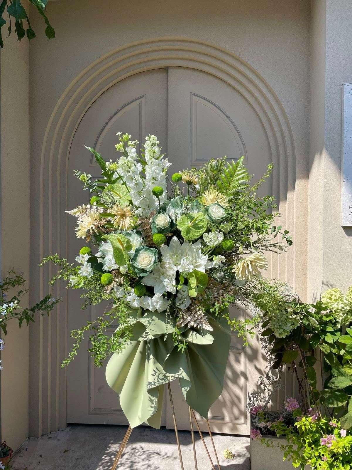 Kệ hoa được thiết kế theo tông xanh trắng chủ đạo, mang đến cảm giác tươi mới, thanh thoát và sang trọng. Sự kết hợp hài hòa giữa các chất liệu hoa tươi và lá phụ tạo nên bố cục mềm mại, có chiều cao, giúp tổng thể vừa nổi bật vừa giữ được nét tinh tế, nhẹ nhàng. Gam màu xanh trắng không quá rực rỡ nhưng vẫn đủ thu hút, phù hợp với nhiều không gian và nhiều dịp tặng khác nhau.