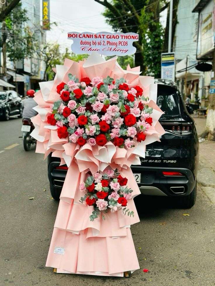 Với kiểu dáng kệ cao, bố cục nổi bật và sự phối hợp màu sắc hài hòa giữa đỏ và hồng pastel, sản phẩm rất phù hợp để sử dụng trong các dịp khai trương, chúc mừng, sự kiện hoặc gửi tặng đối tác, bạn bè, người thân. Đây là mẫu kệ hoa vừa thể hiện sự trân trọng, vừa gửi gắm lời chúc may mắn, thành công và phát triển một cách nổi bật, trang nhã và giàu cảm xúc.